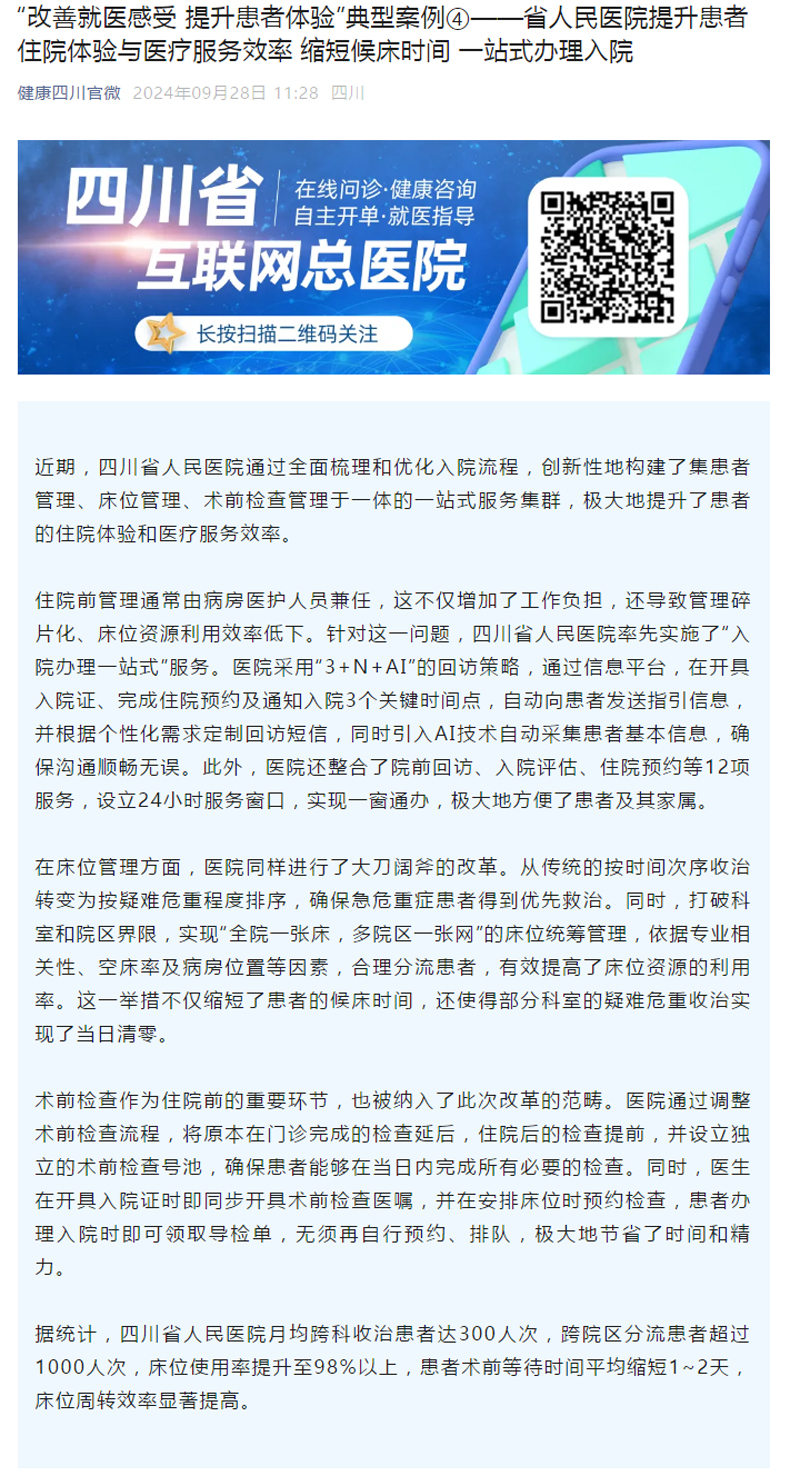 “改善就医感受 提升患者体验”典型案例④——省人民医院提升患者住院体验与医疗服务效率 缩短候床时间 一站式办理入院