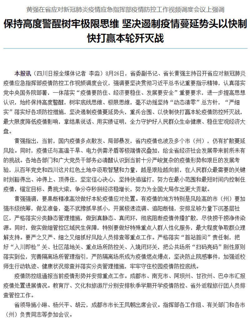 黄强在省应对新冠肺炎疫情应急指挥部疫情防控工作视频调度会议上强调:保持高度警醒树牢极限思维 坚决遏制疫情蔓延势头以快制快打赢本轮歼灭战