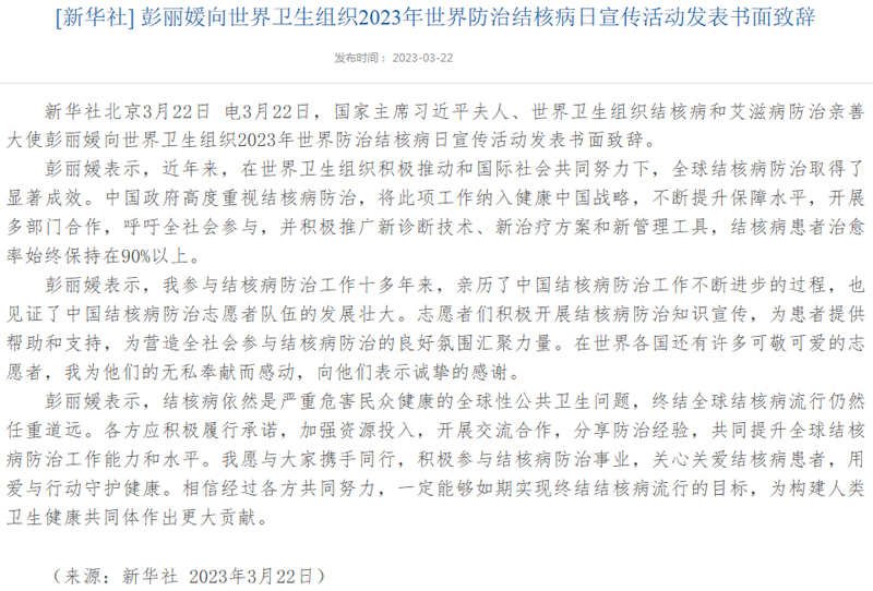 彭丽媛向世界卫生组织2023年世界防治结核病日宣传活动发表书面致辞