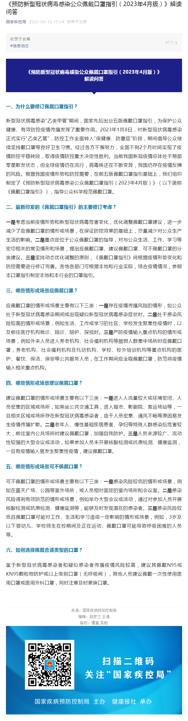 《预防新型冠状病毒感染公众佩戴口罩指引(2023年4月版)》解读问答