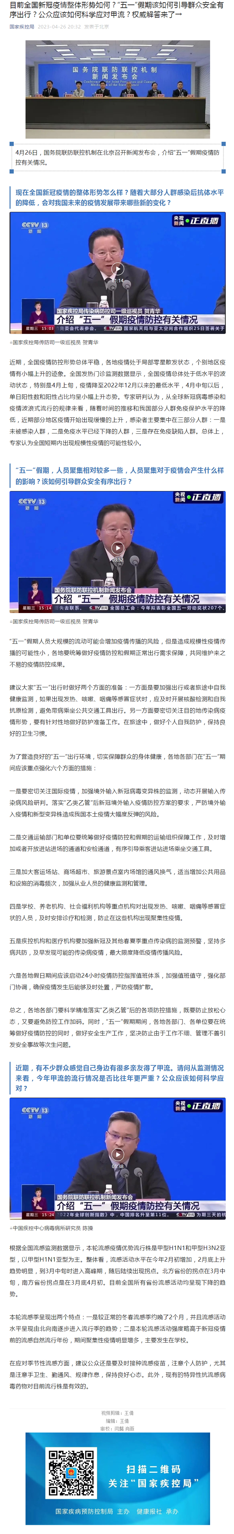 目前全国新冠疫情整体形势如何?“五一”假期该如何引导群众安全有序出行?公众应该如何科学应对甲流?权威解答来了