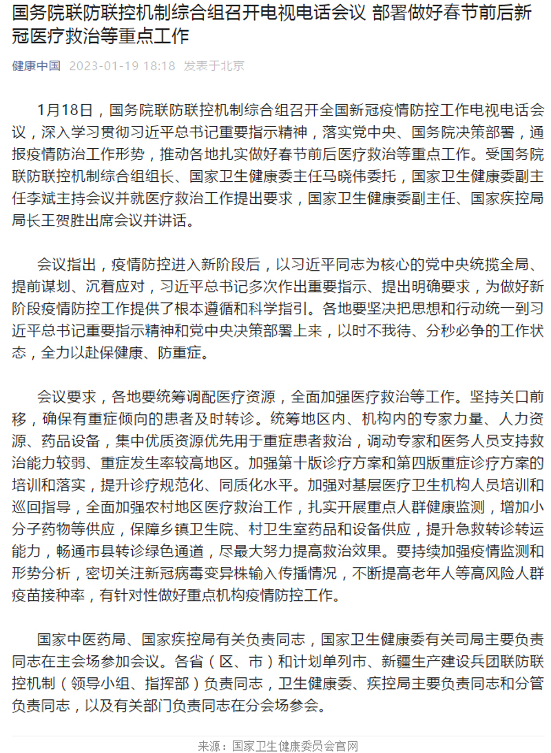 国务院联防联控机制综合组召开电视电话会议部署做好春节前后新冠医疗救治等重点工作