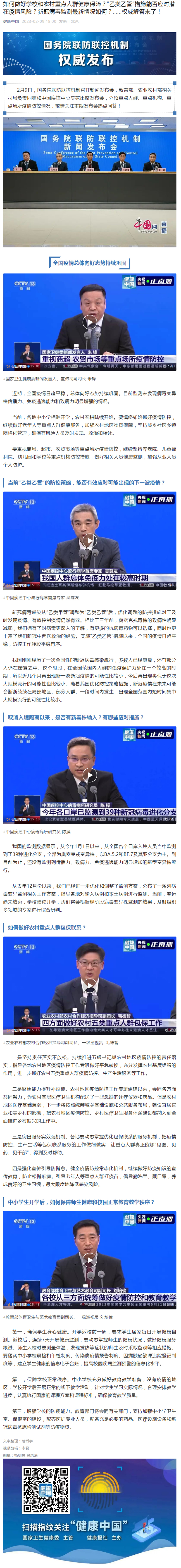 如何做好学校和农村重点人群健康保障?“乙类乙管”措施能否应对潜在疫情风险?新冠病毒监测最新情况如何?......权威解答来了!