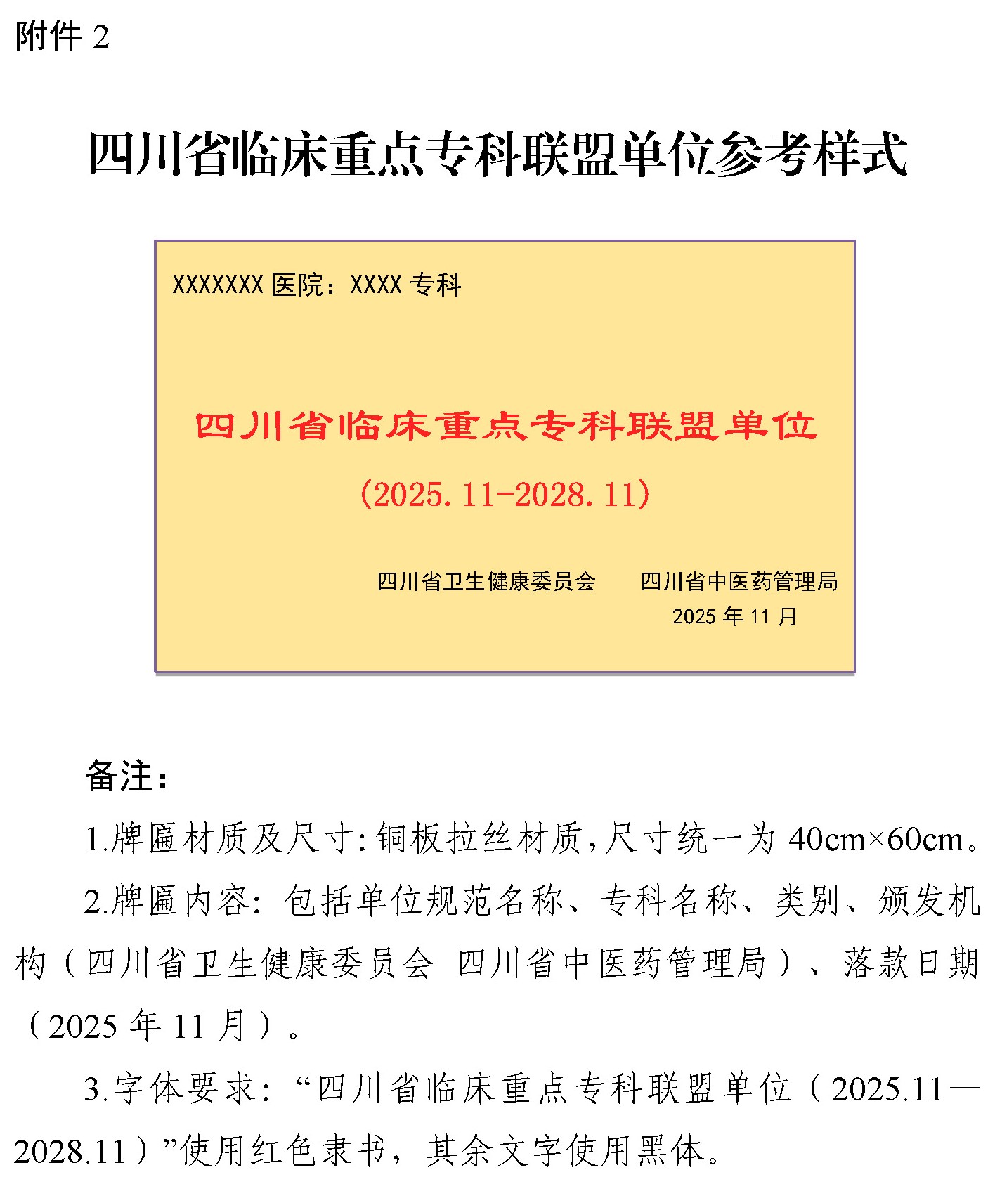 第二批省级临床重点专科联盟单位挂牌“四川省临床重点专科联盟单位”,请有关单位按照要求统一制作、统一管理,放在显著位置并妥善保管维护,保持整洁、醒目,以便群众辨识,不得伪造、转让或损毁。