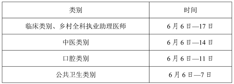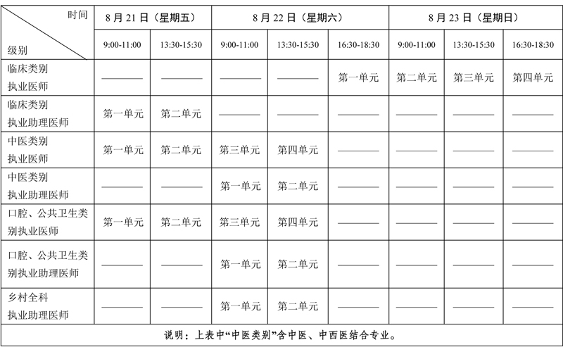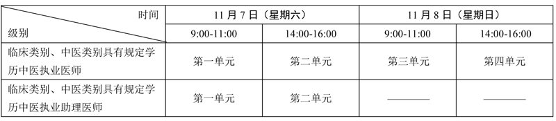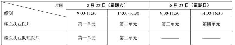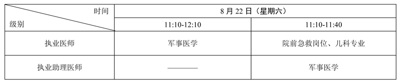 考试实行计算机化考试,军队现役人员、文职人员加试军事医学,院前急救岗位和儿科专业加试相应内容。中医类别藏医专业实行纸笔考试。统一考试时间如下: