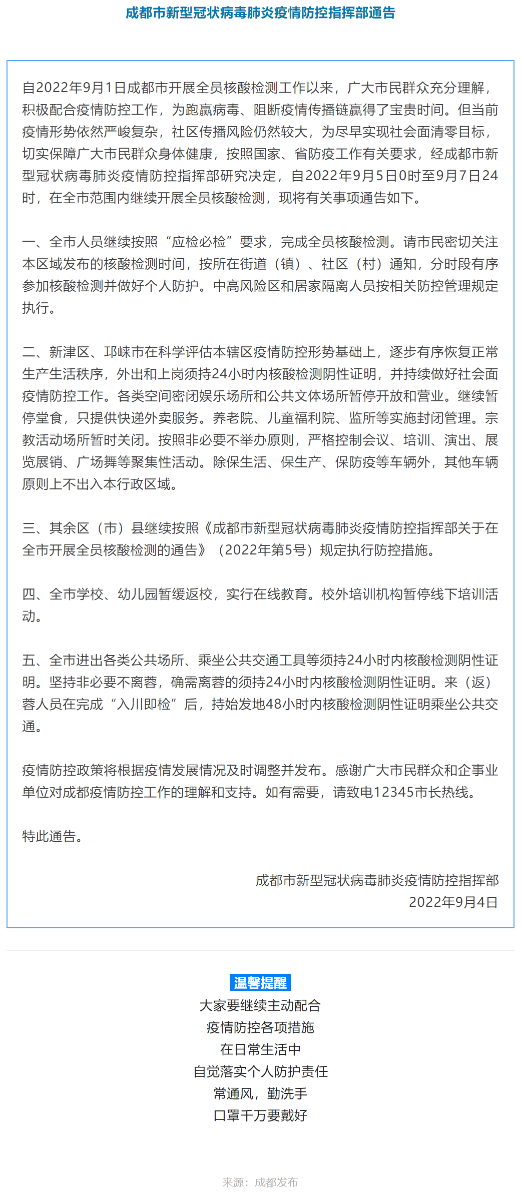 成都市新型冠状病毒肺炎疫情防控指挥部通告