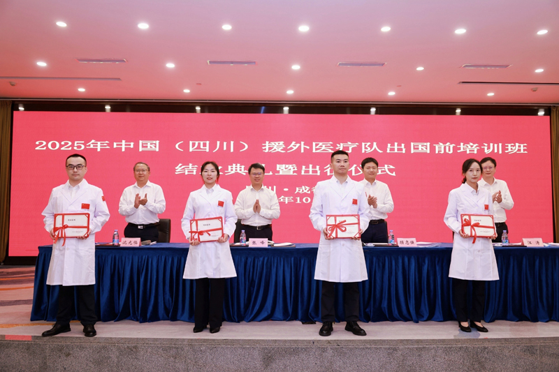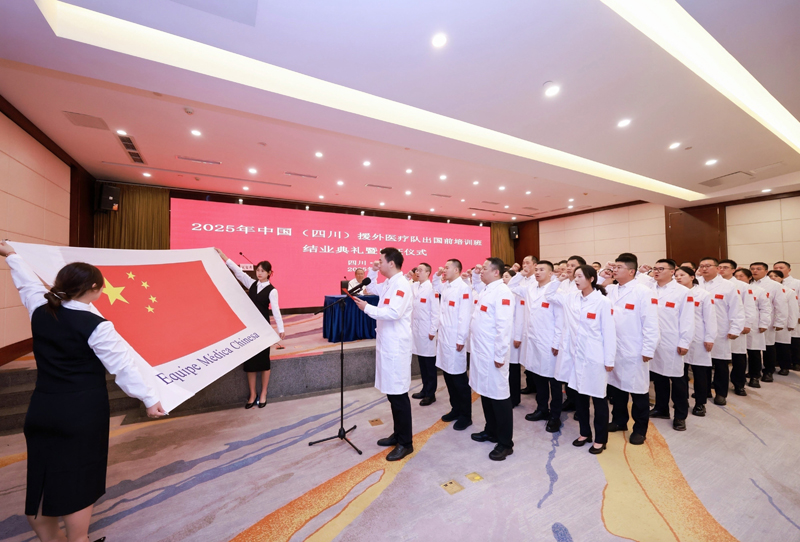 仪式上,与会人员观看了援外医疗队培训纪实视频。成都市卫生健康委、四川大学华西医院、四川省医学科学院·四川省人民医院代表派员单位作了交流发言。承训单位成都外国语学院对本期援外医疗队出国前培训工作进行了总结。与会领导为医疗队员颁发结业证书并授旗。全体队员面对队旗庄严宣誓。