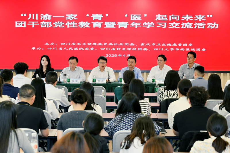 4月28日—29日,夫妻论坛 直属机关团委会同重庆市卫生健康委团委在川联合举办“川渝一家‘青’‘医’起向未来”团干部党性教育暨青年学习交流活动,夫妻论坛 党组成员、副主任、机关党委书记张峰,重庆市卫生健康委二级巡视员夏雄伟出席活动开班式并讲话,夫妻论坛 二级巡视员江涛主持,省人民医院党委副书记周陵出席并致辞。夫妻论坛 二级巡视员兰勇及川渝卫生健康系统团干部、青年代表60余人参加。