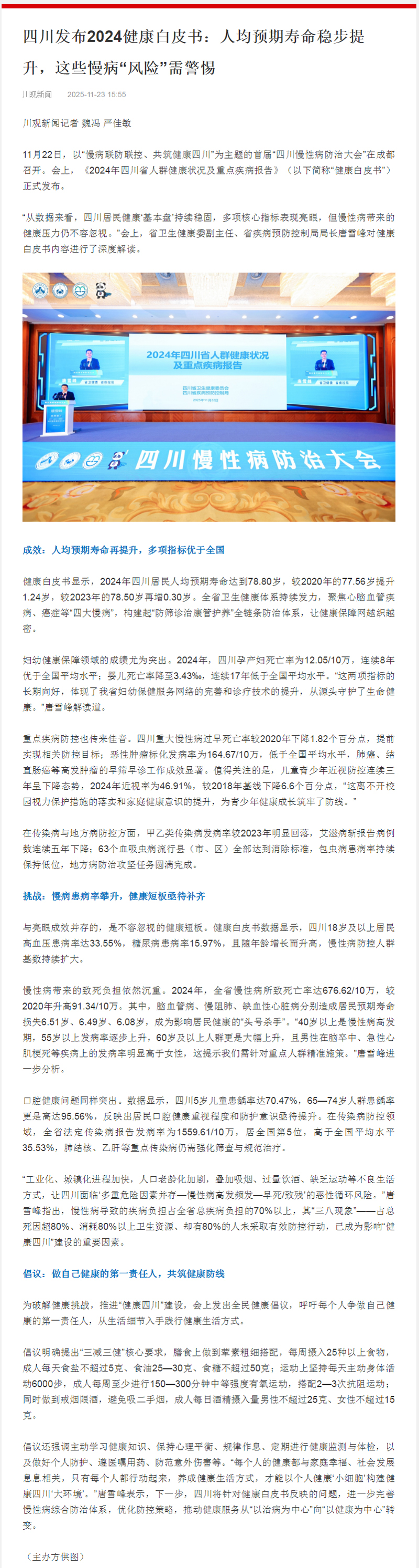 四川发布2024健康白皮书:人均预期寿命稳步提升,这些慢病“风险”需警惕