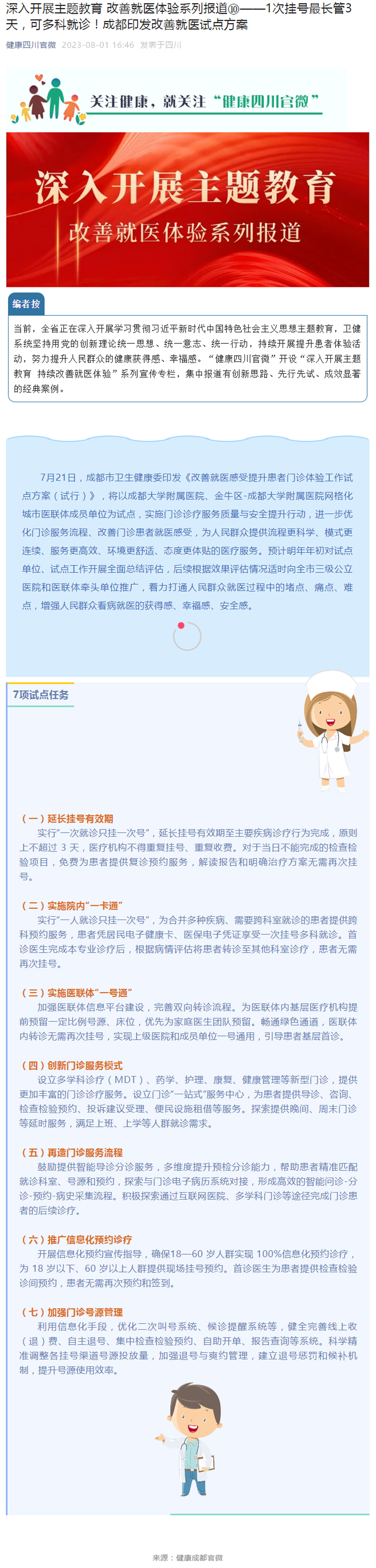 深入开展主题教育 改善就医体验系列报道⑩——1次挂号最长管3天,可多科就诊!成都印发改善就医试点方案