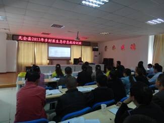 为认真组织好全县农村卫生人员培训项目,根据《雅安市卫生局关于印发<雅安市2013年农村卫生人员培训项目实施方案>的通知》文件的精神和要求,天全县卫生局于2014年5月18日在天全县人民医院五楼学术厅集中开展了村卫生室人员急诊急救知识培训。