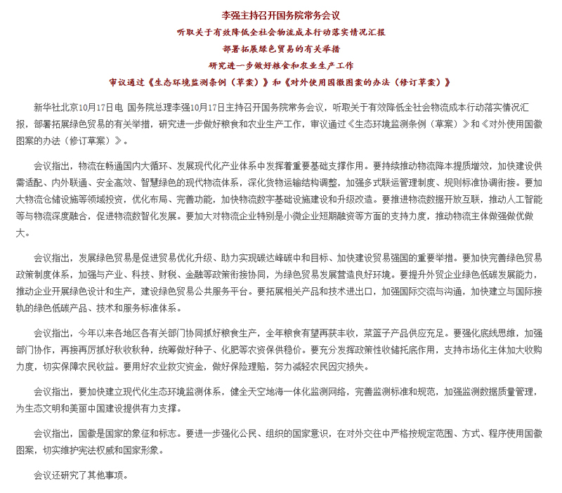 李强主持召开国务院常务会议 听取关于有效降低全社会物流成本行动落实情况汇报等