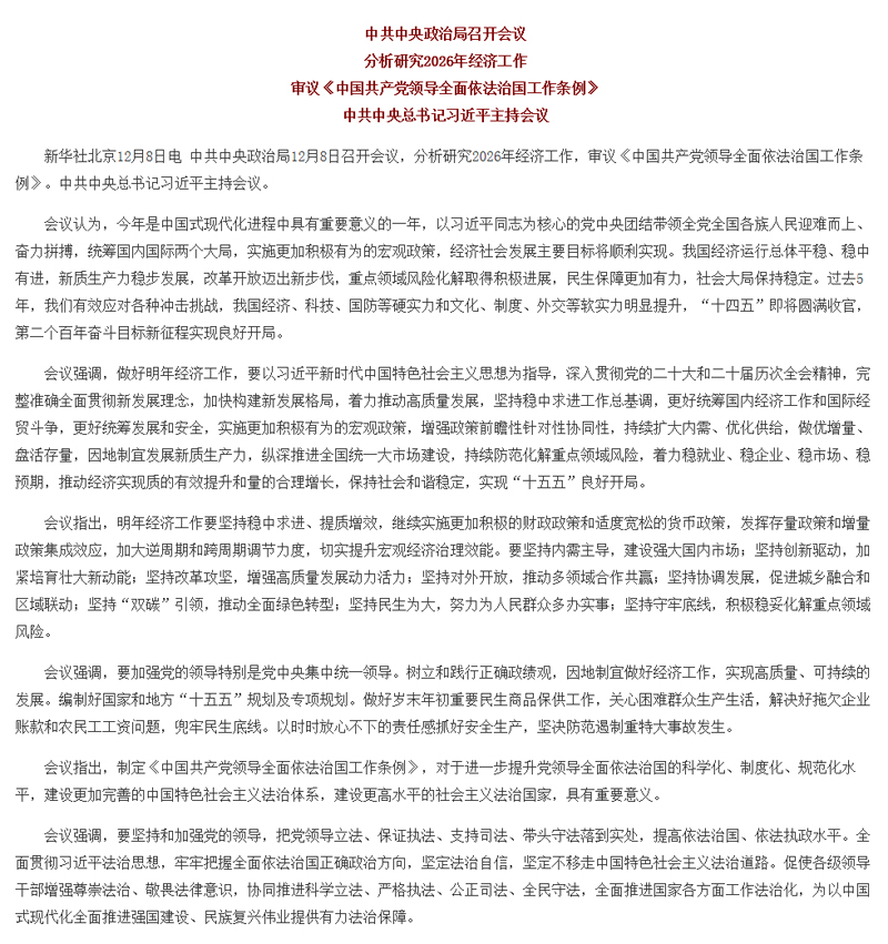 中共中央政治局召开会议 分析研究2026年经济工作 审议《中国共产党领导全面依法治国工作条例》 中共中央总书记习近平主持会议