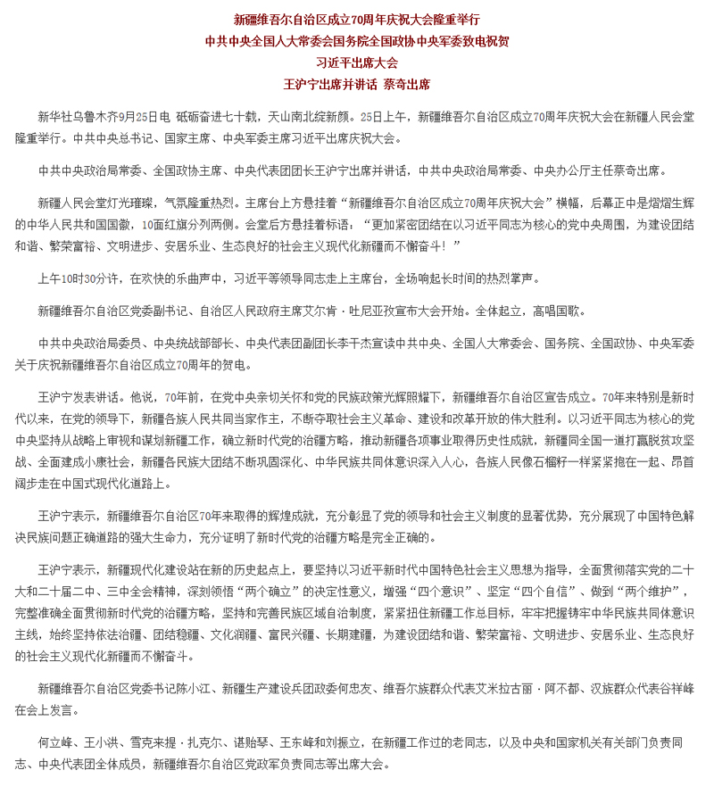 新疆维吾尔自治区成立70周年庆祝大会隆重举行 习近平出席大会