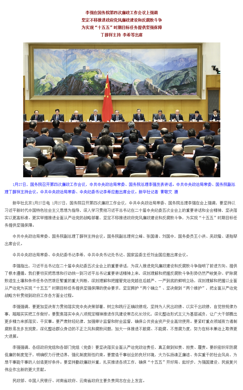 李强在国务院第四次廉政工作会议上强调 坚定不移推进政府党风廉政建设和反腐败斗争 为实现“十五五”时期目标任务提供坚强保障 丁薛祥主持 李希等出席