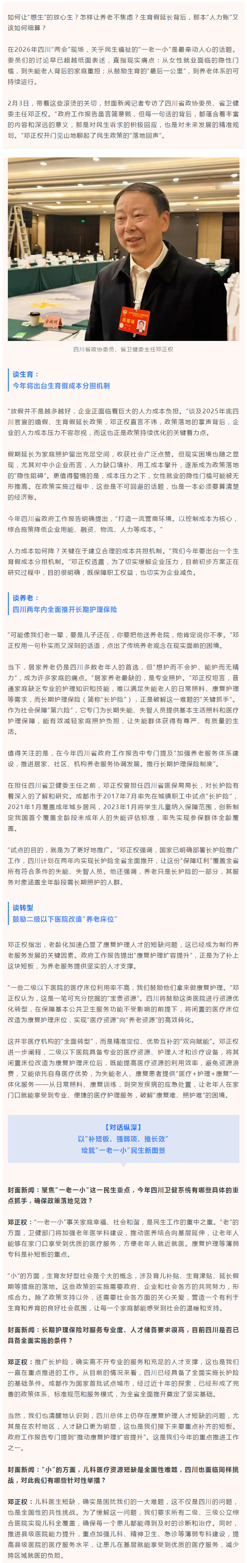 四川省政协委员、省卫健委主任邓正权:生育假成本如何分担?长护险何时全省推开?