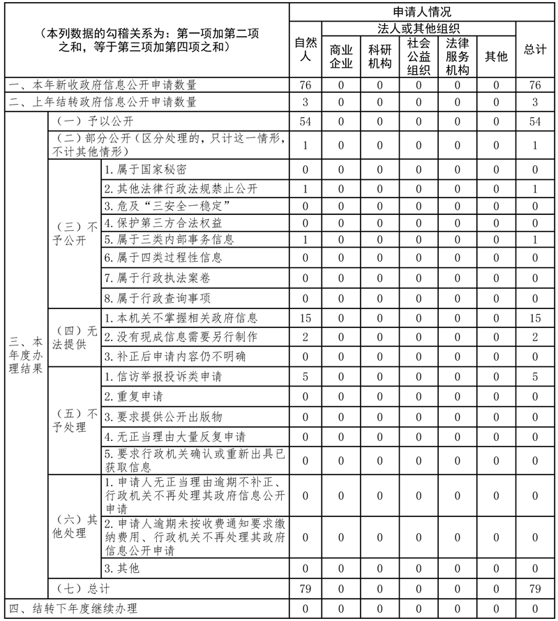 2021年,我委共收到政府信息公开申请76件,办理2020年结转件3件,当年办结79件。