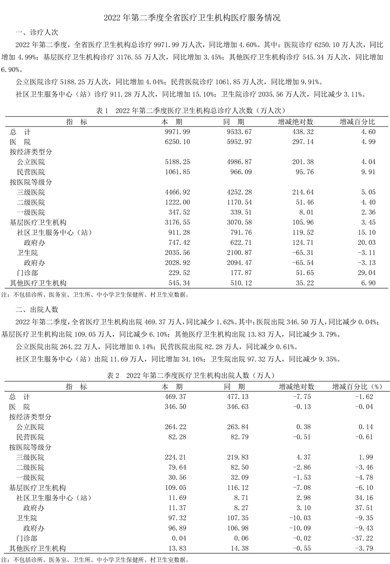 2022年第二季度全省医疗卫生机构医疗服务情况