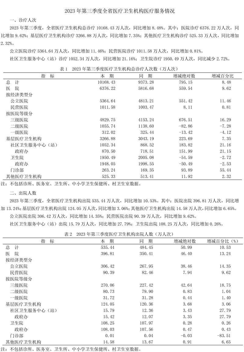 2023年第三季度全省医疗卫生机构医疗服务情况