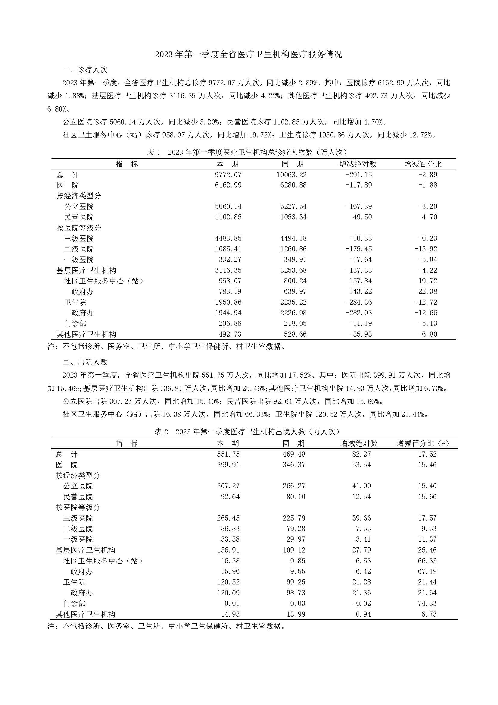2023年第一季度全省医疗卫生机构医疗服务情况